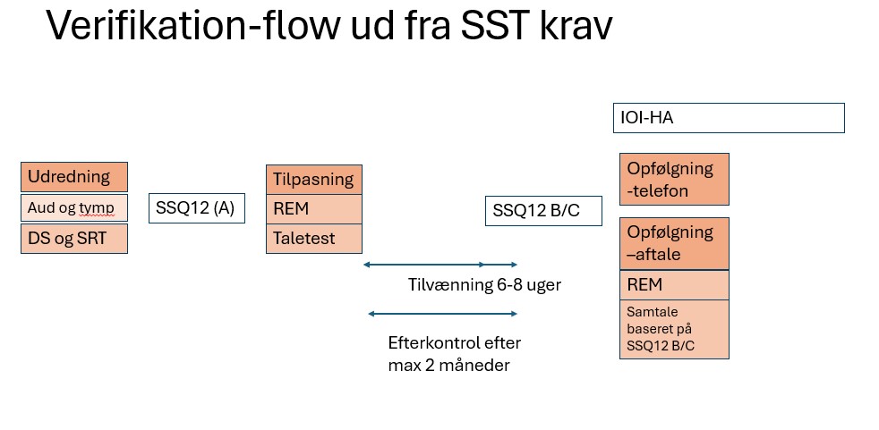 Brugen af spørgeskemaer omtales i Sundhedsstyrelsens kvalitetskrav i kapitel 5 om opfølgning og i kapitel 8 om monitorering. I disse afsnit omtaler Sundhedsstyrelsen spørgeskemaet SSQ-12 der skal benyttes i kvalitetssikringen på høreklinikkerne. Det beskrives at det kan udleveres før tilpasningen og igen efter tilpasningen, hvor det kan benyttes som grundlag for efterkontrollen. Til den anden udlevering af SSQ-12 spørgeskemaet benyttes en -B eller -C udgave, afhængig af om det udsendes til en førstegangs eller en erfaren bruger. I Dokumentet er det anført, at det forventes at IOI-HA spørgeskemaet fortsat anvendes som en monitor af den overordnede kvalitet af tilpasninger fra klinikken.